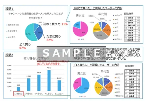 キャンペーンで取得したデータはレポートとして提供。性別・年代・居住地といった顧客の属性はもちろん、レシート情報に基づく購買情報やアンケート情報も抽出可能です。
