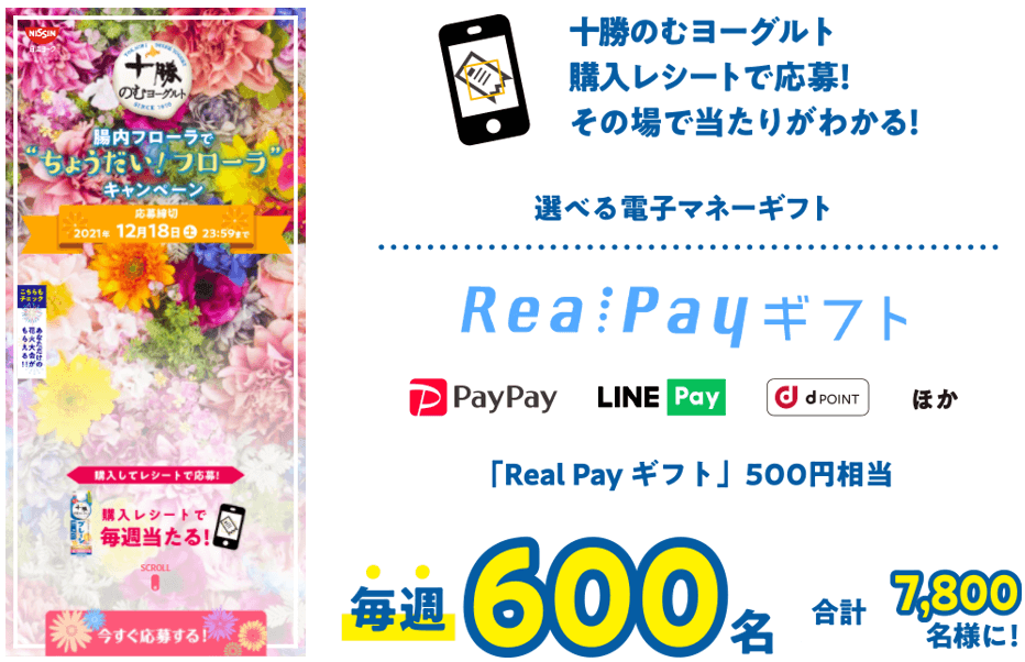 レシート応募で”選べる”デジタルギフト「RealPayギフト」(500円相当)を毎週600名様、合計7,800名様にプレゼント。
