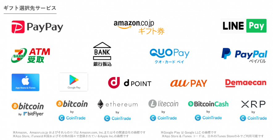 また、決められたギフトを受け取る従来のデジタルギフト・サービスとは異なり、交換先としてPayPay、QUOカードPayなど多くのキャッシュレス・サービスを保有しているため、受け取ったギフトは身近な店舗で利用することが可能となり、ユーザーにとって利便性の高いデジタルギフト・サービスとなっております。