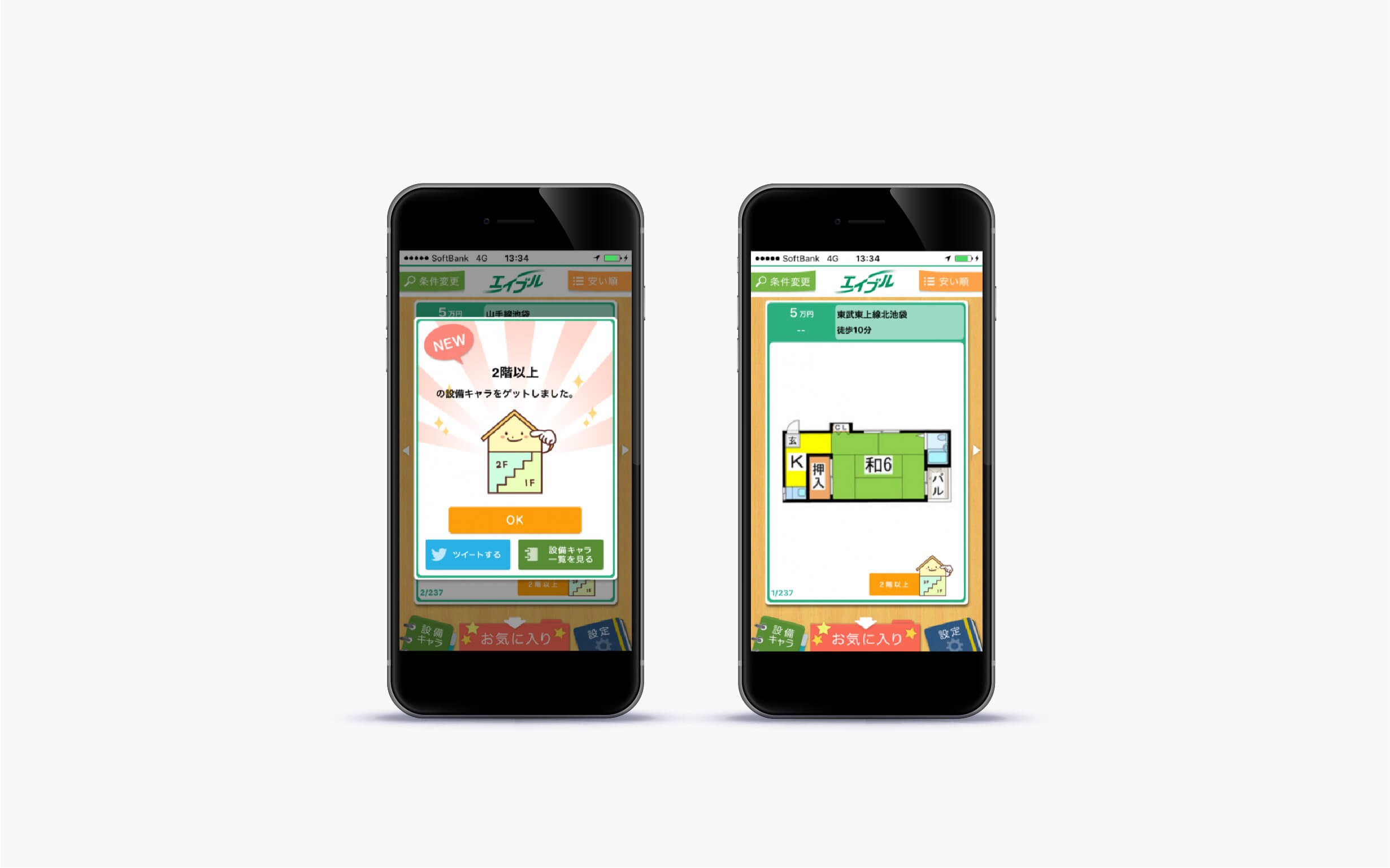 SOLUTION間取り図を大きく見せるUIにし、タップではなく上下左右のフリック操作を多用しユーザの操作性を高めました。また、物件の特徴に合わせてキャラクターをつけ、キャラクターをコンプリートするという楽しみを付加しました。他にはない気持ちの良いUIと楽しみのあるアプリをご提供しました。